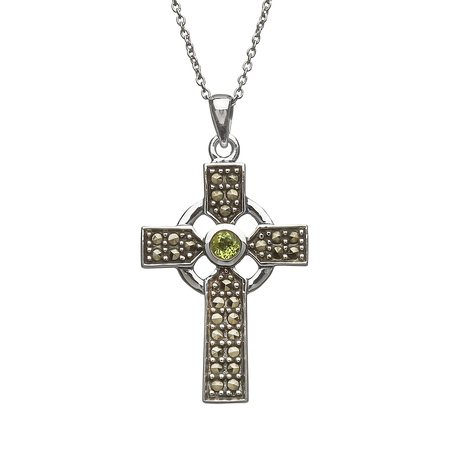 Celtic Cross set with marcasite stones and a green cubic zirconia centre stone available with an 18 inch silver chain. If you require a longer or heavier chain, email us at info@briandestaic.com