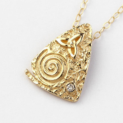 The Hibernia Diamond Pendant is a tribute to the ancient Celts, evoking the mystery and spirit of Ireland. A stately spiral, adorned with a trinity knot and diamond accent, is carefully crafted in 14 and 18 karat gold by Brian de Staic in Ireland. Hallmarked by the Assay Office at Dublin Castle, it comes with an 18 inch chain and a beautiful display box. Contact us at info@briandestaic.com for a longer chain at an additional cost.