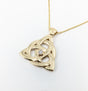 Experience the mesmerizing allure of the 14k Innisfallen pendant, adorned with a beautiful .12ct bezel set diamond. This pendant features a trinity knot intertwined with a single circle, symbolizing an unbreakable bond. It serves as a timeless reminder of unity and the lasting connection between two individuals.