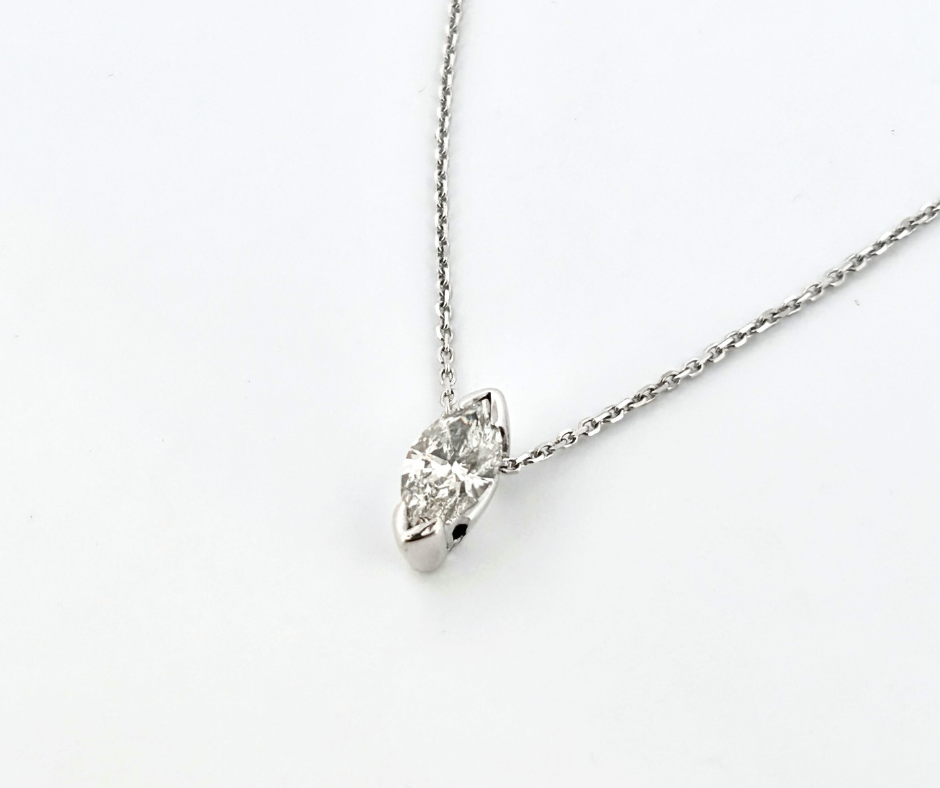 Experience the stunning brilliance of the .7ct Marquise Cut Diamond Pendant, set in 18 karat white gold with an 18 karat chain. Elevate your style with this necklace that exudes elegance and sophistication.