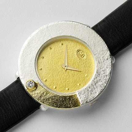 Introducing the BdeS Collection's Bín Diamond Watch, inspired by the sparkling waves of Bín Bán beach in Dingle, Co.Kerry. Meticulously handcrafted by Brian de Staic, this timepiece features an 18k gold face, a two-toned sterling silver/18K case and bezel with a dazzling diamond accent. Each watch also comes with a luxurious leather strap and a sterling silver buckle.