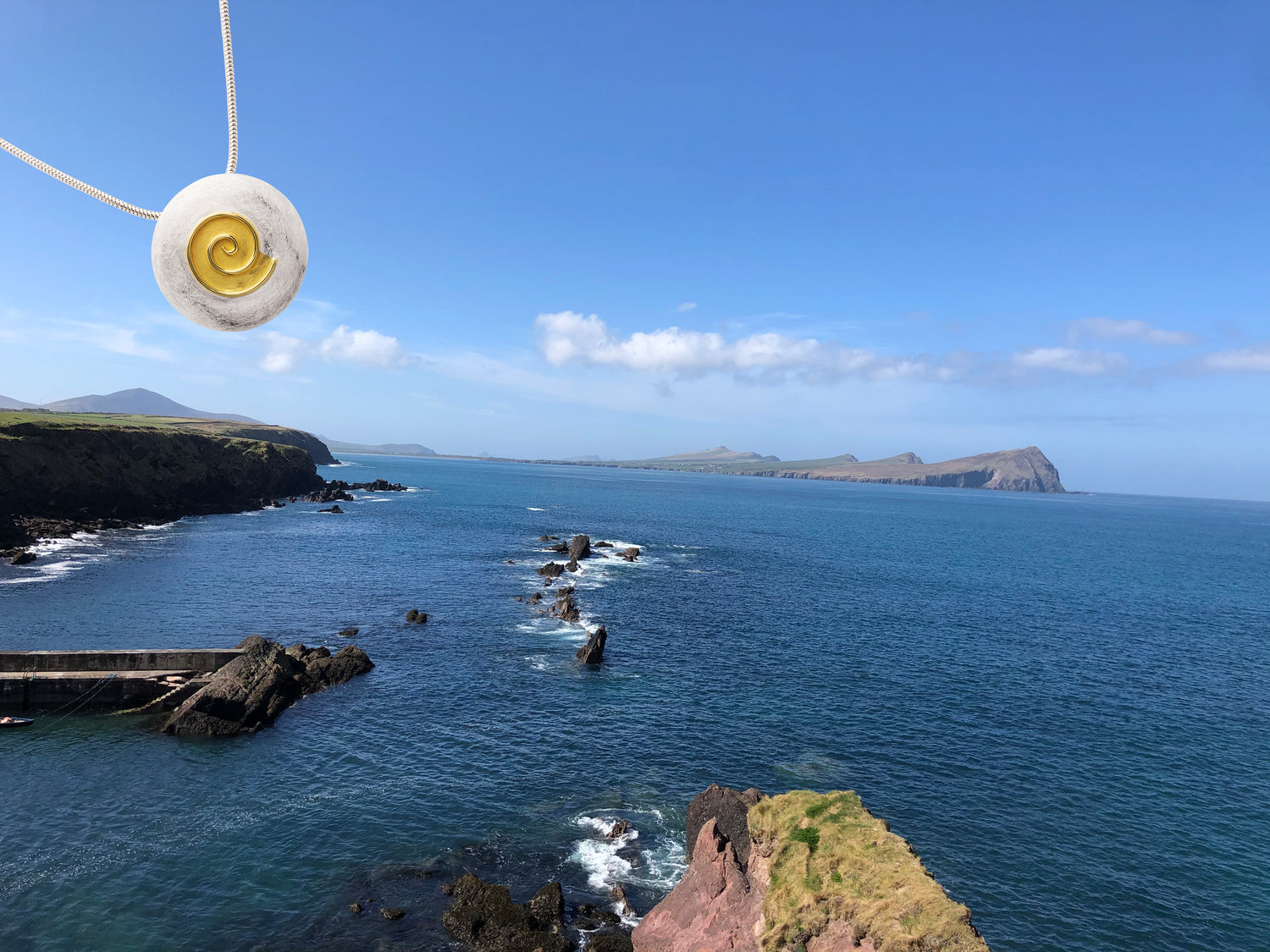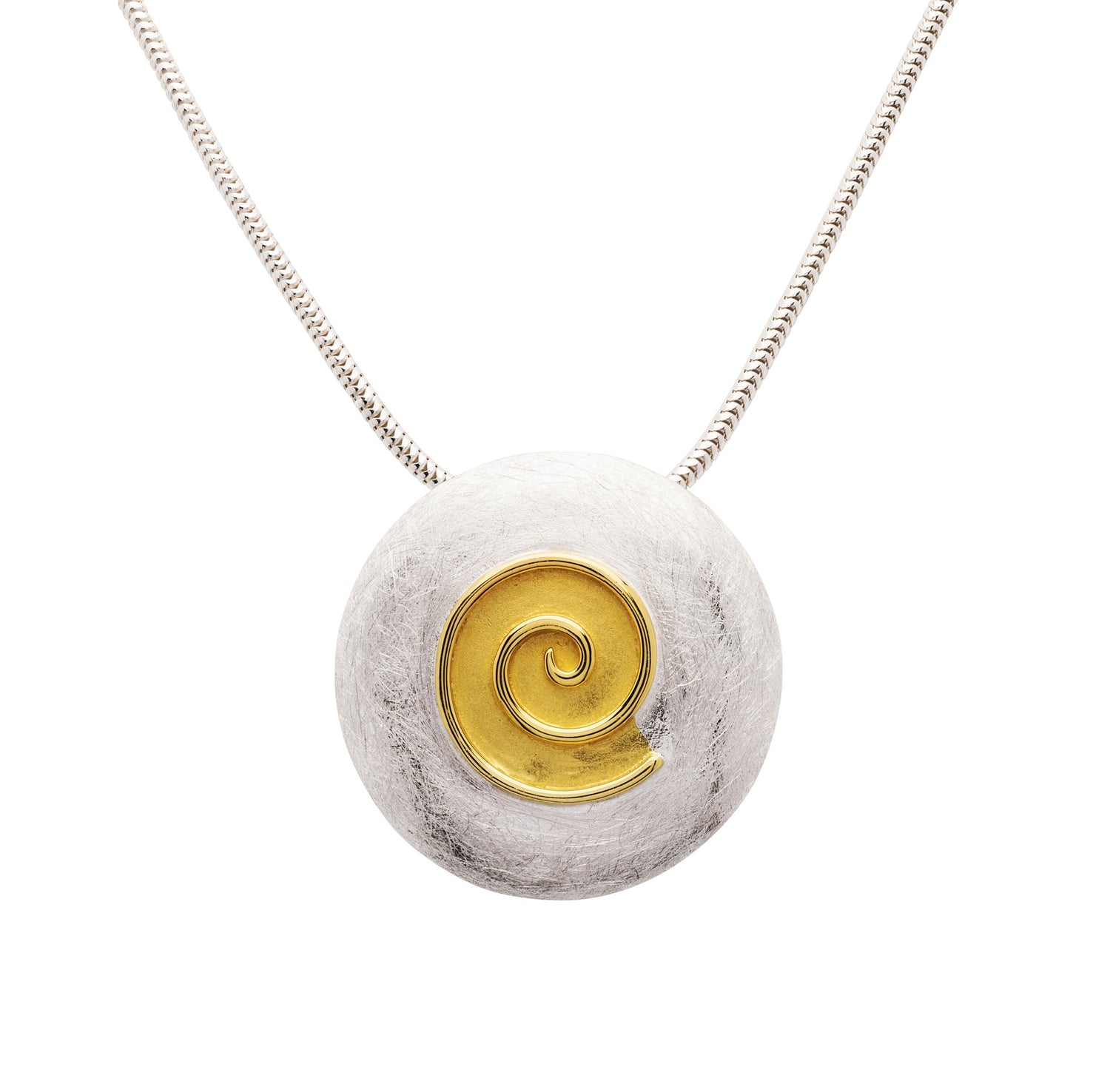 Indulge in the beauty of Celtic art with this round brushed sterling silver pendant featuring a gold plated spiral. The spiral, a symbol steeped in the culture and history of the Celts, represents growth, evolution, eternity, and continuity. This design was inspired by the BdeS spiral collection, influenced by the 5,000 years old site of Newgrange in the Boyne valley. Own a piece of Irish heritage and adorn yourself with this meaningful spiral pendant.