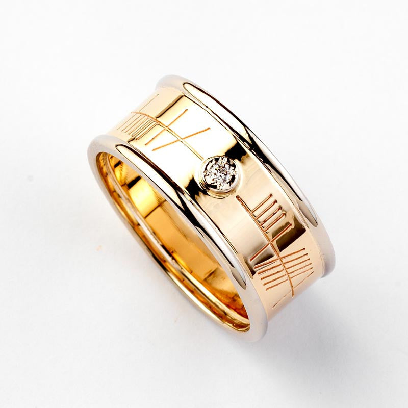 Ogham Yellow Gold Ring with White Gold Trim & Diamond - Wide